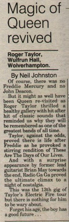 The noise when Brian appeared was incredible and nearly 22 years on it still amazes me. If you ever hear the bootleg, the place really did go that wild. I can still remember what looked like The Red Special being tuned behind Pete Malandrone's (Brian May's tech assistant) coat. If only there was a video!