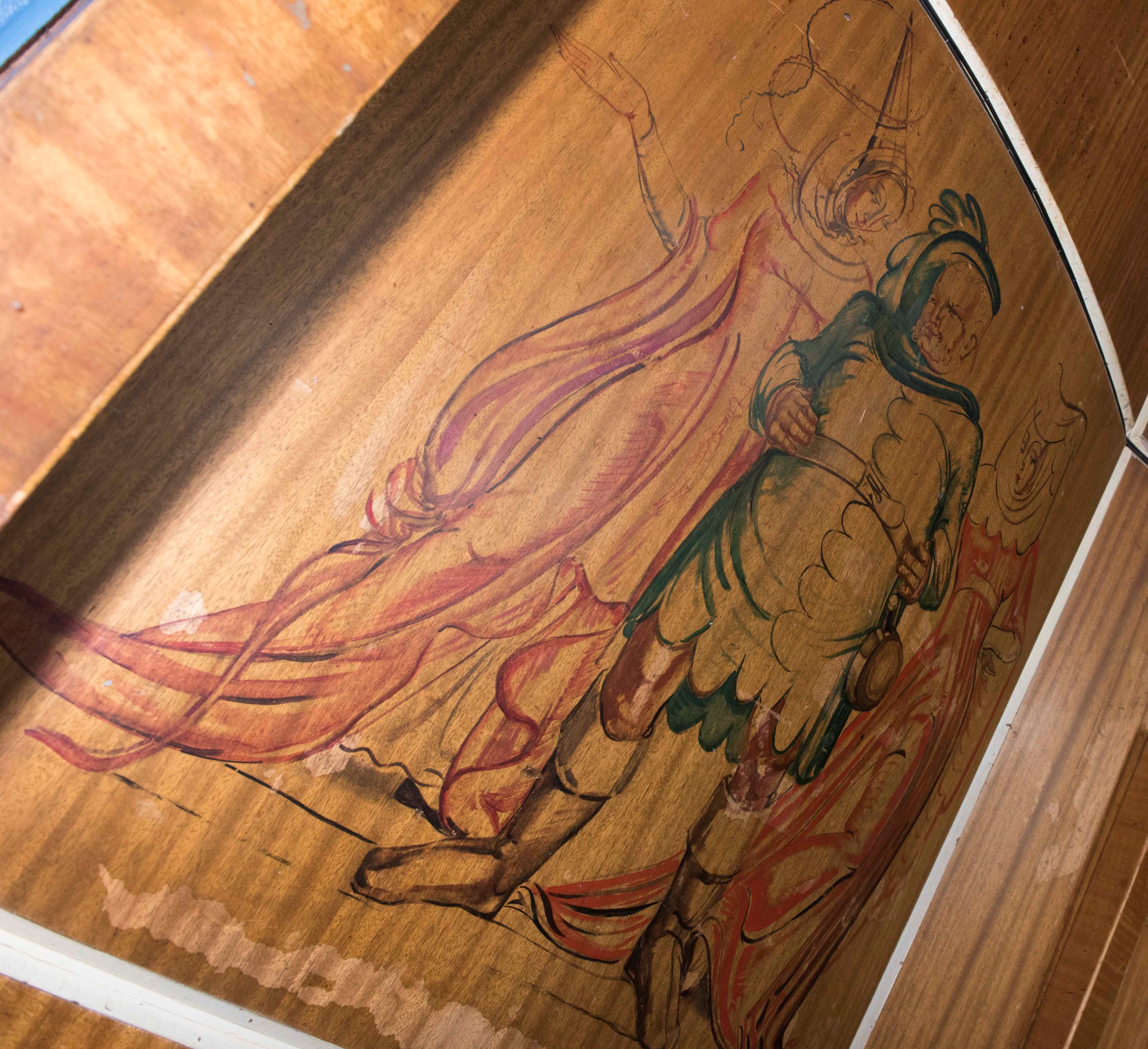 Detail of a scene on the wooden panels painted by Muriel Gilbert, an artist who produced many of the paintings on the HMS Queen Mary.