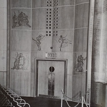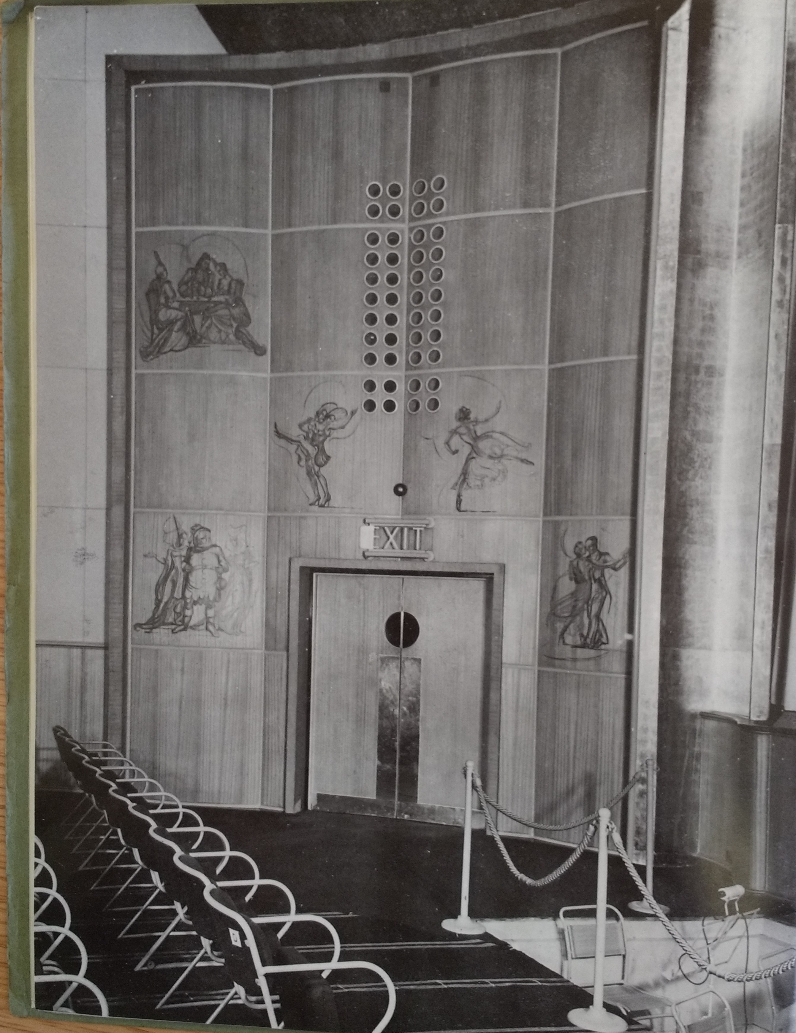 Murals on the doors leading to the Wulfrun Hall. They were made by Muriel Gilbert, an artist who produced many of the paintings on the HMS Queen Mary