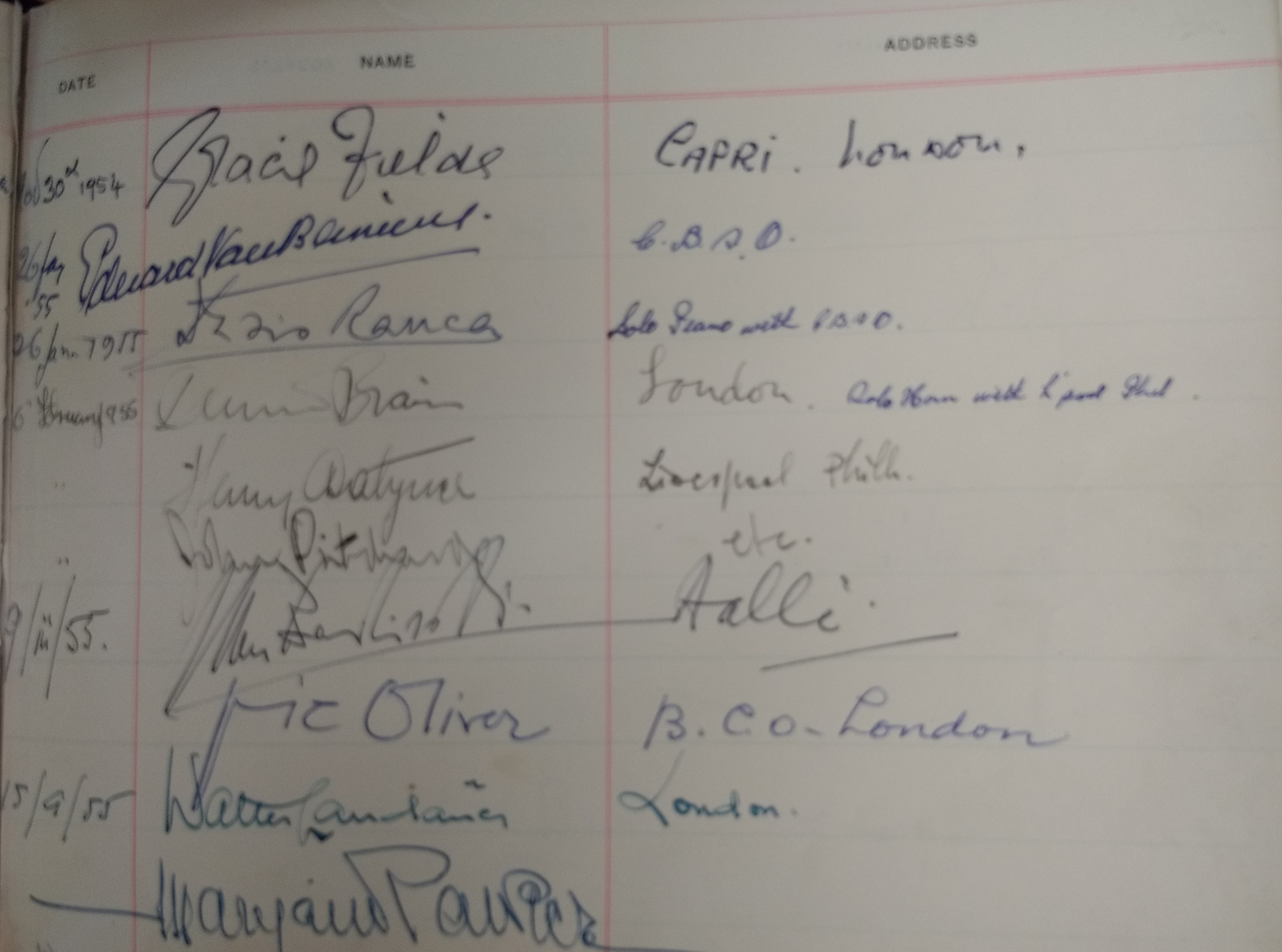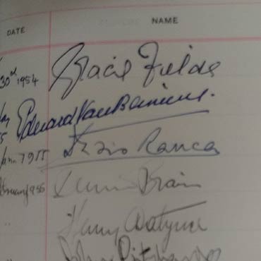 Gracie Fields giving her two addresses in our visitor book. Her signature is followed by those from a variety of orchestras which played here in the fifties.