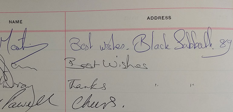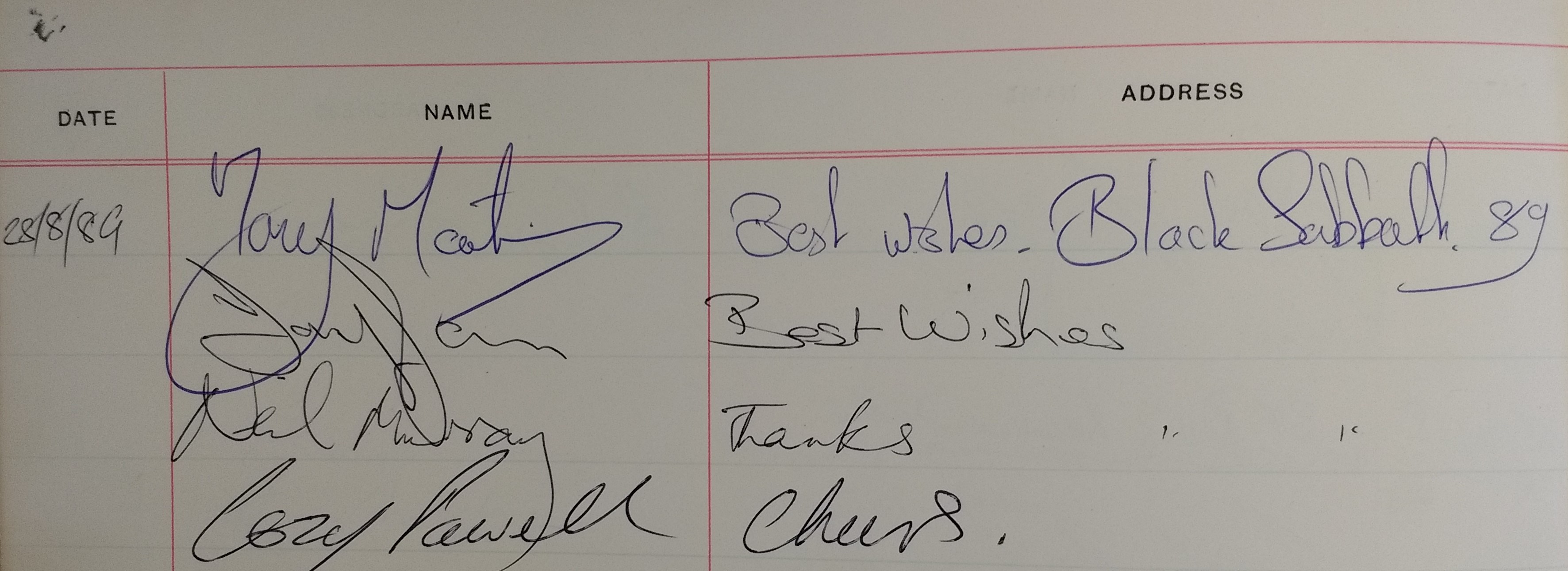Signatures from Birmingham rockers Black Sabbath who performed in August 1989.