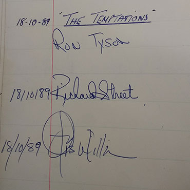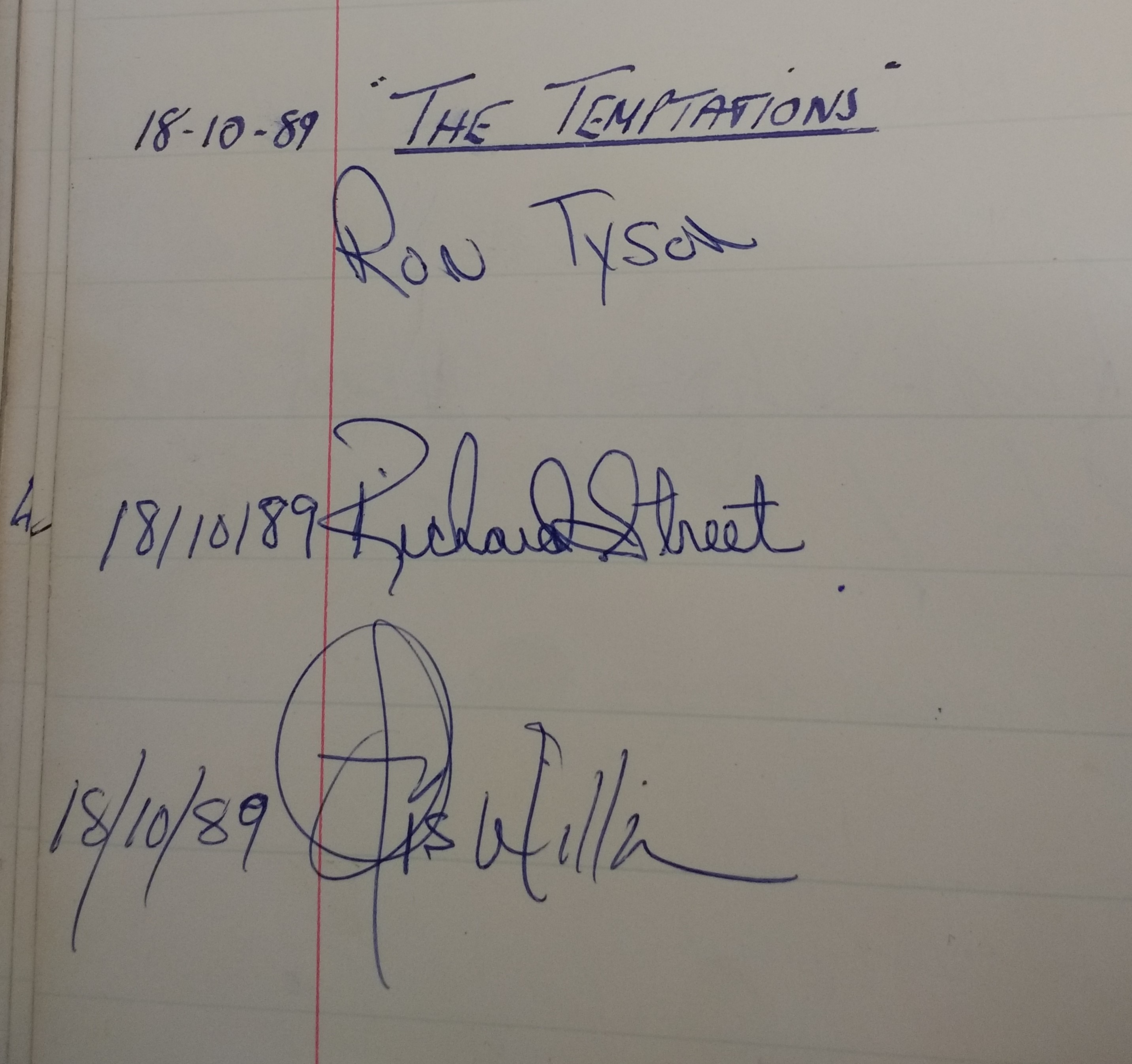 American vocal group The Temptations played in 1989. Signatures of tenor Ron Tyson, baritone Richard Street and tenor Otis Williams.